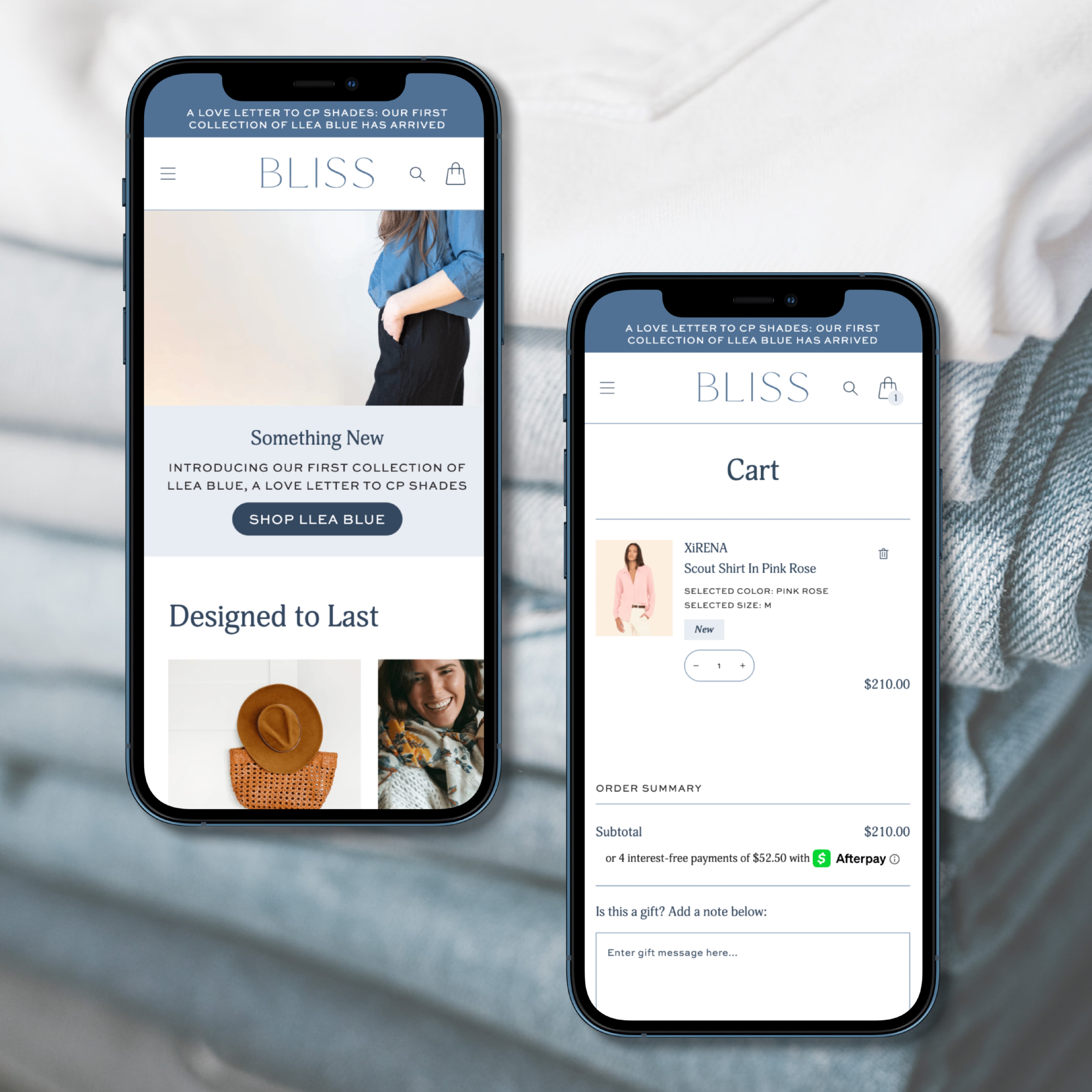 Our work for Bliss centered around the collection experience, ensuring that shoppers could see and “feel” the breadth of the boutique's offerings. With custom functionality designed to surface brand and fit information, our design put photography front and center after clear navigation and best-in-practice Shopify theme features.