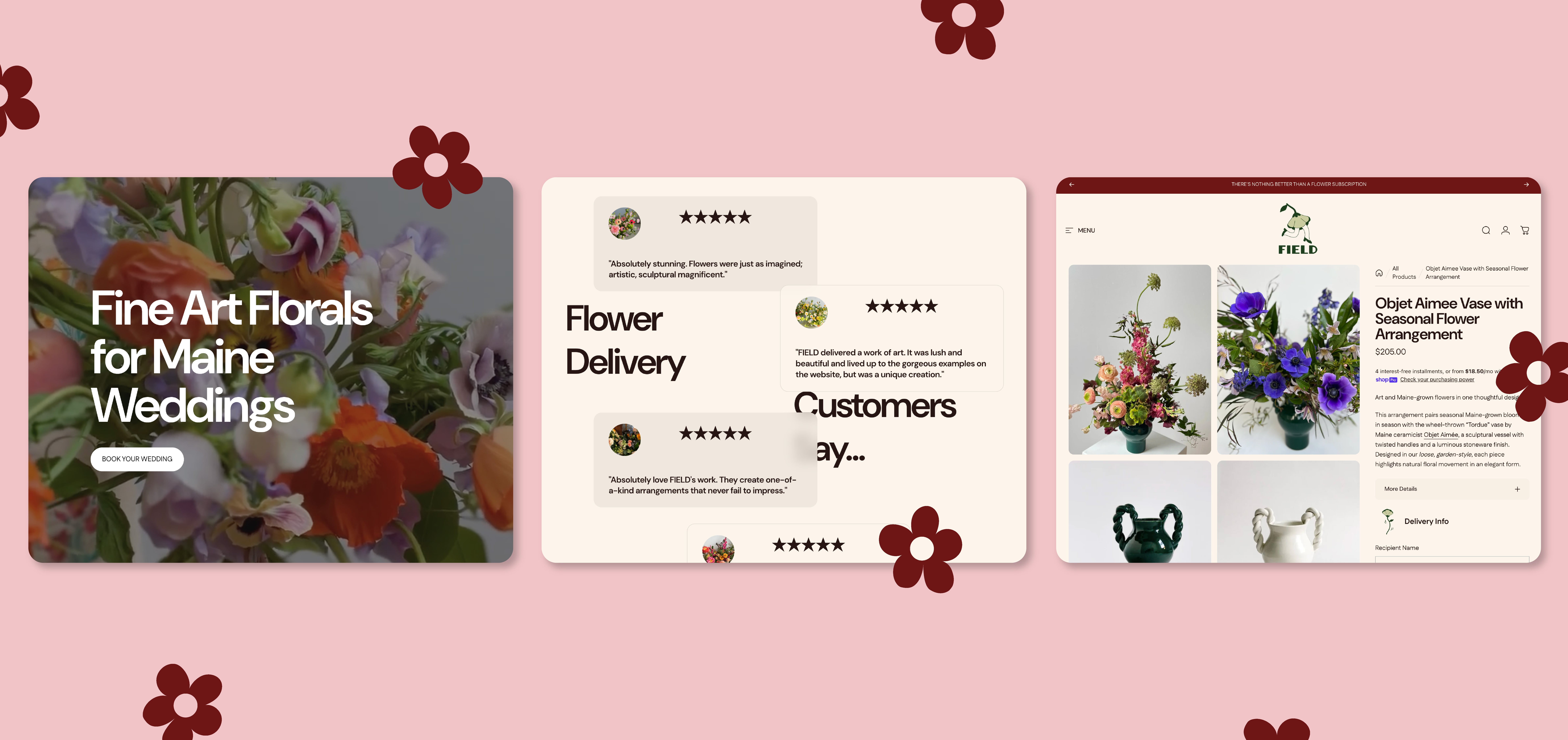 The resulting visual system—including logo, color palette, typography, and patterns—reflects Field’s artful maximalism and captures their commitment to sustainability, their materials-driven design process, and their position as boundary-pushing floral artists in Maine.