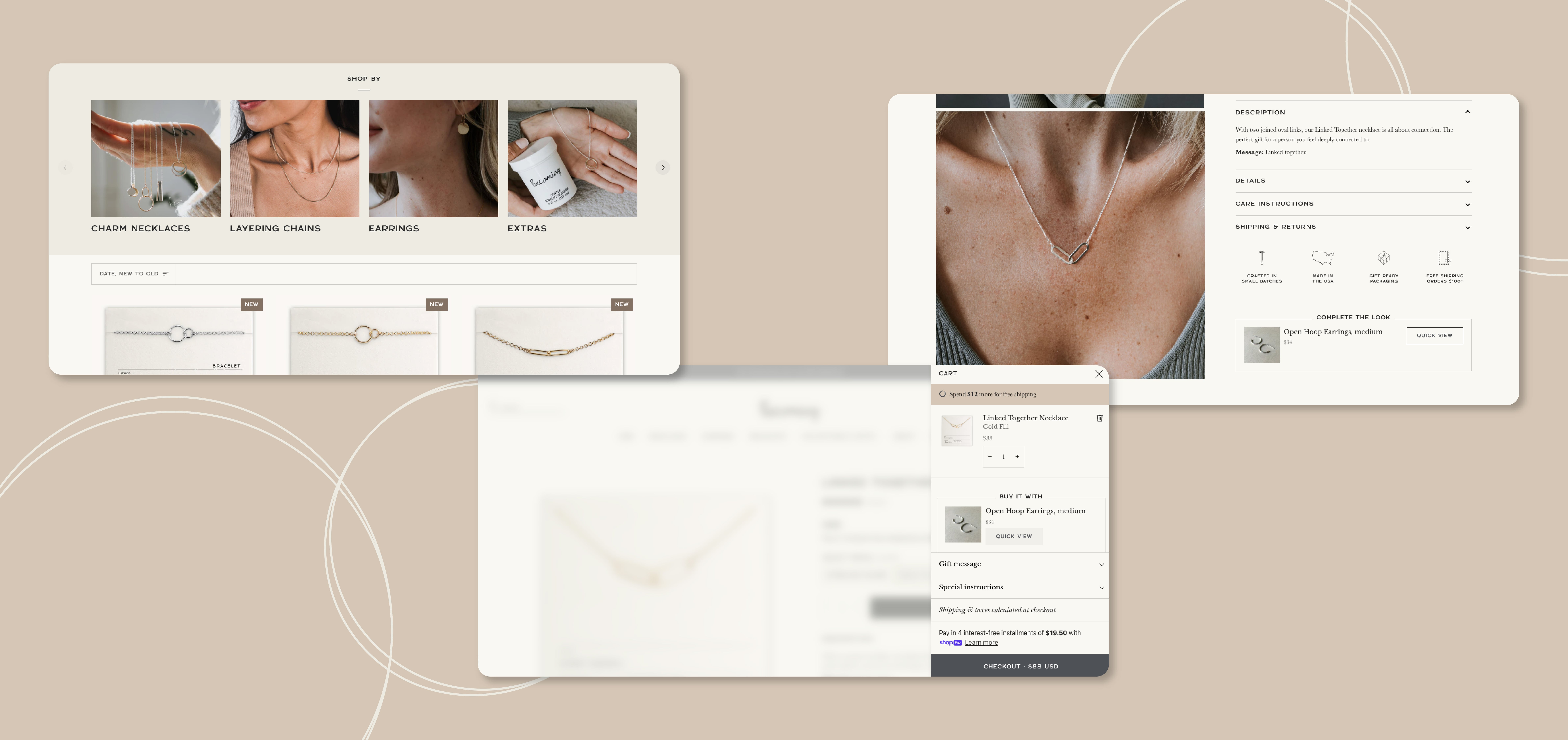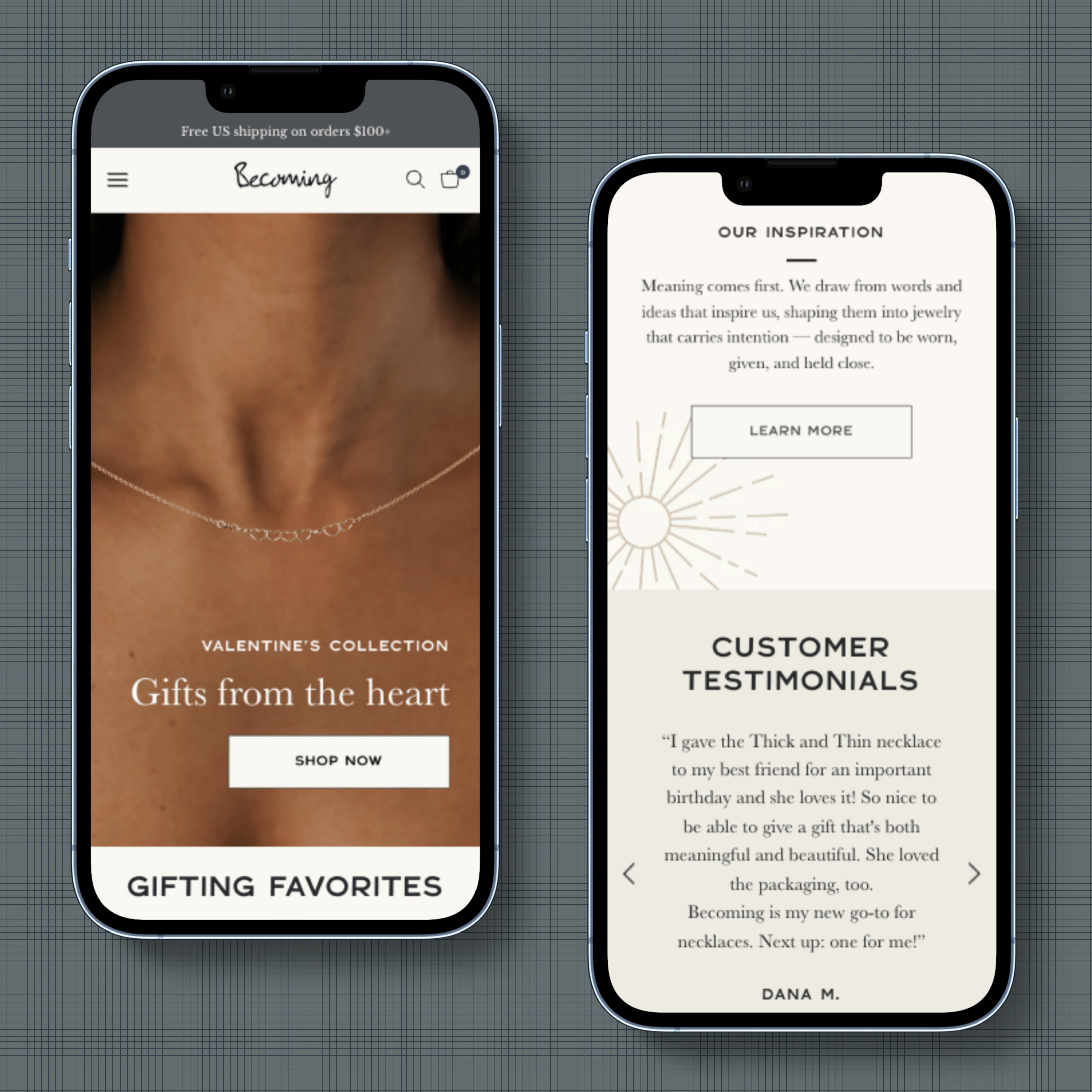Working with Tracey Graves, Becoming's founder, we built out a website designed to foster product discovery and conversion. Working with the brand's understated aesthetic that lets the jewelry shine, we focused on thoughtful spacing and typography to create an elegant, refined feel. We strategically incorporated trust-building elements and add-on product features to increase average order value.